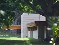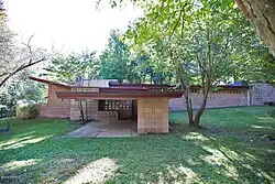 The David and Christine Weisblat House is located at 11185 Hawthorne Drive,[15][52] on the northern side of the road.[27] The original house was designed by Wright, while his apprentices William Wesley Peters and John H. Howe designed an annex.[7][53] Peters and Howe's annex runs at a 120-degree angle to the original house,[54][55] extending northeast of Wright's structure.[53] To the east is a standalone garden shed with a concrete-block facade, a small window, and a hip roof.[53] There is also a frog pond to the southwest, which measures about 14 by 20 feet (4.3 by 6.1 m)[4][11] and dates from the construction of the house's annex.[11]