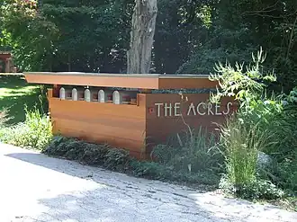 A creek and a bog run through the Acres; the presence of these geographical features had been particularly attractive to Frank Lloyd Wright, the architect who designed four of the Acres' five houses.[26] There is a pond at the northern end of the development, which is cited as covering 3 acres (1.2 ha)[16] or 4 acres (1.6 ha) and was created by placing a dam across the creek.[11] The pond is fed by a natural stream on the site. Prior to the development of the Acres, the stream was too shallow for swimming or fishing; depending on the time of year, it could measure as small as 12 inches (300 mm) wide and 6 inches (150 mm) deep.[18] Early plans for the development entailed the creation of multiple terraces with ponds, though this was ultimately not done.[11][18] The rest of the Acres contains vegetation and trees.[11] There is a communal tennis court next to the Eppstein House, which dates from 1958.[27]
