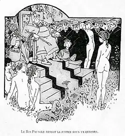 'King Pausole dispensed justice under a cherry tree'. Illustration after Carlègle, 1907