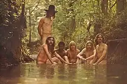 The gatefold cover of the vinyl LP features the band posing nude in a brook. The shot was original manager Phil Walden's idea, and the brook was on his brother Alan's property.[38] Alan later recalled, "The [inner sleeve] photo was taken in Round Oak, Georgia, down behind my log cabin there, which is also the back of Otis Redding's Big O Ranch".[39] Rolling Stone editor Jann Wenner was present with Boz Scaggs, whom he was producing at the time.[38] They brought bubbles to cover themselves up, but the bubbles were washed away by the stream.[40] Trucks had sliced his leg open earlier that day, requiring thirteen stitches, and was unable to get in the water; he is standing behind Oakley in the shot.[40] Walden suggested the band take a few shots standing full-frontal; the band was reluctant but he assured them they would never see the light of day. At their first performance at the Fillmore East that December, Trucks discovered the full-frontal shots were printed in a broadsheet alternative newspaper.[40]