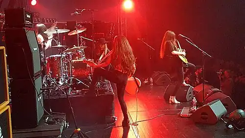 The first show for the new line-up of Montgomery, O'Toole and Buchanan was in the Netherlands on 20 April, as the band returned to the Dijkrock Festival. The same trio performed in support of Terrorvision at four shows across England from 2–5 May.[45] The first Amorettes show as a quartet, with Jaye joining on bass guitar and Buchanan switching to rhythm guitar, was at the Osteguna Rock Festival in Vitoria-Gasteiz, Spain on 20 June. The band performed at the Blue Balls Festival in Lucerne, Switzerland, on 25 July supporting Airbourne,[46] before returning to the UK for the Steelhouse Festival in Wales on 28 July to perform in support of Thin Lizzy, Living Colour and Uriah Heep among others.[47]