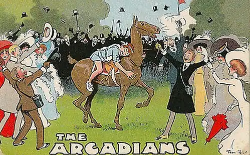 They begin their crusade at Askwood races, where it is Cup Day. They cause considerable curiosity, being still clothed in the costumes of Arcady (everyone else is dressed up formally in this scene, anticipating the similar scene in My Fair Lady 50 years later).[n 2] But instead of improving the Londoners, the Arcadians adopt some of their wicked ways, including betting on the races. Here Simplicitas meets his wife Mrs. Smith, who, not recognising her husband, proceeds to fall in love with the young stranger. Simplicitas flirts with her and agrees to help her open up an Arcadian restaurant in London. Then comes an opportunity for Simplicitas to distinguish himself. Jack Meadows, who was to have ridden his temperamental horse "The Deuce" has been thrown by the animal, and Peter Doody, the hapless replacement jockey, has also been injured by "The Deuce". Sombra arranges that Simplicitas shall take his mount, as the Arcadians have the gift of speech with animals, and the brute becomes as gentle as a lamb. Simplicitas (while sound asleep), upon "The Deuce," wins the race, to the great satisfaction of its owner. Romantic complications ensue between Meadows and Eileen Cavanagh, a young Irish woman.