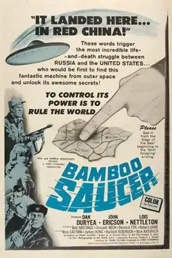 The Bamboo Saucer is an independently made 1968 Cold War science fiction film drama about competing American and Russian teams that discover a flying saucer in Communist China.[1] The film was re-released in 1969 under the title Collision Course with a reduced edited runtime of 90 minutes.