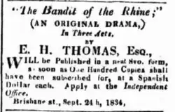 The Bandit on the Rhine is a 1835 Australian play by Evan Henry Thomas. It was once considered the first play written and published in Australia although it seems to have been preceded by The Bushrangers and The Tragedy of Donohoe.[2][3][4]