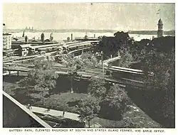 Several elevated railroad lines or "els" were being built to Battery Park by the late 19th century, but they were controversial for several reasons. Because the els were originally pulled by steam trains until 1902, this caused substantial pollution at Battery Park.[37] The New York Elevated Railroad Company opened the Battery Place elevated station at Battery Place, on the park's northern end, in 1872. This was followed by the opening of the two-track South Ferry elevated station at the park's southern end in 1877.[38] New York Elevated Railroad agreed to beautify Battery Park as a condition of being allowed to construct the station, but the elevated station's construction soon prompted opposition among people who wanted the elevated tracks removed.[39]