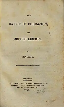 The Battle of Eddington: Or, British Liberty is a 1796 historical tragedy play written by the English author John Penn. It first appeared at Richmond Theatre before its West End premier at the Theatre Royal, Haymarket in London on 28 March 1796.[1] It featured songs by the composer John Wall Callcott.[2] It is inspired by the Battle of Edington in 874 when the English forces of Wessex under Alfred the Great defeated a Viking army. Penn dedicated the play to the Prime Minister of the United Kingdom William Pitt.