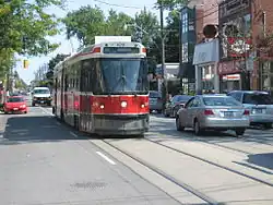 A streetcar of the 501 Queen line at the Beaches. The Toronto Transit Commission operates several streetcar lines in the area.