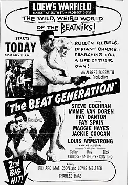 The Beat Generation is a 1959 American crime film from Metro-Goldwyn-Mayer starring Steve Cochran and Mamie Van Doren, with Ray Danton, Fay Spain, Maggie Hayes, Jackie Coogan, Louis Armstrong, James Mitchum, Vampira, and Ray Anthony.[2] It is a sensationalistic interpretation of the beatnik counterculture of the "Beat Generation" (and is sometimes considered one of the last films noir to be produced.) The movie was also shown under the title This Rebel Age. The movie is about a "beatnik" who is a serial rapist, who is pursued by a police detective. The director was Charles F. Haas.[2] Richard Matheson and Lewis Meltzer are credited with the screenplay.