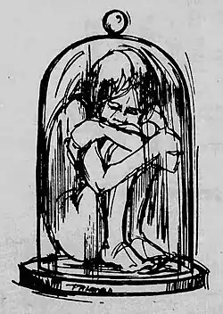 Esther describes her life as being suffocated by a bell jar. A bell jar is a thick glass container sometimes used to create a vacuum space. Here, it stands for "Esther's mental suffocation by the unavoidable settling of depression upon her psyche".[14] Throughout the novel, Esther talks of it suffocating her, and recognizes moments of clarity when it is lifted. These moments correlate to her mental state and the effect of her depression. Scholars argue about the nature of Esther's "bell jar" and what it can stand for.[14] Some say it is a retaliation against suburban lifestyle,[15] others believe it represents the standards set for a woman's life.[12] However, when considering the nature of Sylvia Plath's life and death and the parallels between The Bell Jar and her life, it is hard to ignore the theme of mental illness.[16]