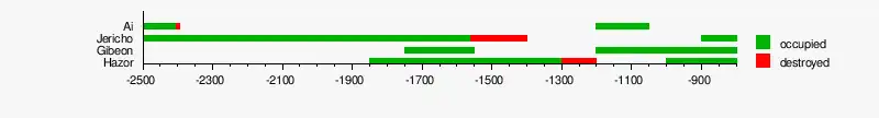 The authors take issue with the book of Joshua's depiction of the Israelites conquering Canaan in only a few years—far less than the lifetime of one individual—in which cities such as Hazor, Ai, and Jericho, are destroyed. Finkelstein and Silberman view this account as the result of the telescoping effect of the vagaries of folk memory about the destruction caused by other events;[24] modern archaeological examination of these cities shows that their destruction spanned a period of many centuries, with Hazor being destroyed 100 to 300 years after Jericho,[25] while Ai (whose name actually means 'the ruin') was completely abandoned for roughly a millennium "before the collapse of Late Bronze Canaan. ... Like Jericho, there was no settlement at the time of its supposed conquest by the children of Israel."[26]