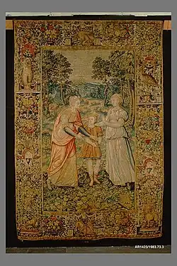 Tapestry depicting Rachel, Dan and Bilhah. Jacob was Rachel's husband, and Bilhah was Rachel's handmaid; Rachel gives Bilhah to her husband and he has two sons by Bilhah: Dan and Naphtali.