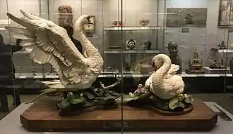Boehm and a team of 14 porcelain artists and craftsmen, including head sculptor Maurice Eyeington,[2] then worked for two years to produce the sculpture, using 10 tons of plaster to create the master molds. The sculpture featured a male and female mute swan, three infant swans, and a natural setting of rocks and grass. Formed from roughly 60,000 sculpted lines, it weighed roughly 250 lbs, and stood over 42 inches high on a 3-foot base. The softness and detail in the feathers of the swans make it "hard to believe [they] are made of porcelain".[1][4][3]