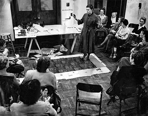 Janet Doub Erickson was founding partner, chief designer, and head of production. She was credited with producing ninety percent of the Blockhouse's designs.[21] Among honors, awards, and recognitions over her professional life, at Blockhouse she was the second young Boston artist chosen for recognition by the Institute of Contemporary Art and was profiled in a 1951 issue of Life [22] She would go on to author books on blockprinting, including Printmaking Without A Press (Reinhold 1966) [23] and Block Printing on Textiles (Watson-Guptill 1961).[24] She taught block printing in Massachusetts, Connecticut, New York, California, and elsewhere over her long career after Blockhouse. Her promotion of block printing was influential in its post-war artistic renaissance. Later in life, she wrote on textile design and vernacular architecture. She also published another book of her line drawings of Boston during the Blockhouse period.