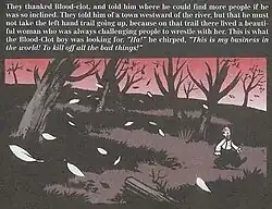 "The Blood-Clot Boy" is a 6-page comic by Al Columbia loosely based on the tales of a legendary hero of the same name in Blackfoot folklore.[1][2][3][4] It was published in the sixteenth issue of Zero Zero (April/May 1997).