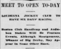 Members of the Boston Club frequently patronized Jockey Clubs of the area, the Eclipse Race Course, the Metairie Race Course and the Fair Grounds Race Course, putting up high stakes purses to help offset the Jockey Club's expenses. "The Boston Club...being composed of gentlemen who know 'what's what'...insured a numerous and distinguished attendance upon these occasions."[55] Later noting "In the betting circles last evening... The wagering was spirited and lively, and a good deal of money will change hands as a result."[55] Boston Club Founder John Randolph Grymes owned filly Susan Yandal who ran in the first races at the Fair Grounds, his cousin Henry Tayloe, younger son of leading turfman J. Tayloe III of The Octagon, was one of the founders of The Louisiana Jockey Club, along with native French Creole Bernard de Marigny.