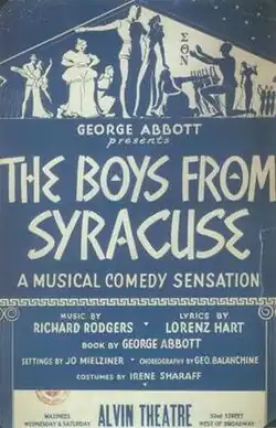 The Boys from Syracuse is a musical with music by Richard Rodgers and lyrics by Lorenz Hart, based on William Shakespeare's play The Comedy of Errors, as adapted by librettist George Abbott. The score includes swing and other contemporary rhythms of the 1930s. The show was the first musical based on a Shakespeare play.[1] The Comedy of Errors was itself loosely based on a Roman play, The Menaechmi, or the Twin Brothers, by Plautus.
