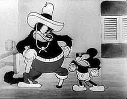 Peg-Leg Pete, who had been seen with two legs in 1928's Steamboat Willie and The Gallopin' Gaucho, is seen with a peg-leg here for the first time in a Mickey Mouse cartoon.[2] In this short, he takes the name Peg-Leg Pedro.[5] Pete speaks for the first time in this cartoon.[2]