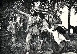 After leaving the party, George goes back to the small house in town where he living. Once back in his bedroom—humiliated and infuriated by his treatment—he strips off his "white man's" formal evening attire and dons traditional native buckskin clothing as well as an elaborate war bonnet. He then leaves the town and rejoins his tribe "in the wilds".[5] Back with his "own people", George agitates a small group of his fellow braves with a fiery speech and bottles of whiskey, and then, after becoming inebriated, he returns by himself to the town to spy on Gladys and to observe her activities. When he sees her go riding alone on horseback into the countryside, George assembles six of his braves, and they chase and capture Gladys while she is gathering wildflowers. George now tries to force his affections on her as his men watch and laugh in the background. Gladys struggles and rebuffs him. She then points to the sky and implores George to allow her to leave, reminding him not to abandon the teachings of God or to ignore the constant "presence of the All Powerful Master".[5] Suddenly ashamed and contrite, George drops to his knees. When he rises, he leads her back toward her horse, but the other braves attempt to stop her. George pushes his men away, draws his knife, and threatens them if they do not allow her to go. The men back off as he helps Gladys onto her horse. After he kisses her hand, she departs. He now finds her handkerchief on the ground, presses it to his face, and exhibits remorse again for his actions. His men appear to be disgusted by this change in his behavior. George rides off alone, still clutching Gladys's handkerchief and visibly sad. After holding the handkerchief to his face one last time, he drops it to the ground and leaves the scene.