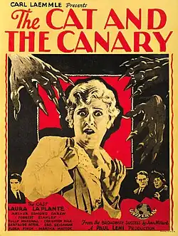 The Cat and the Canary is a 1927 American silent comedy horror film directed by Paul Leni. An adaptation of John Willard's 1922 black-comedy play of the same name, the film stars Laura La Plante as Annabelle West, Forrest Stanley as Charlie Wilder, and Creighton Hale as Paul Jones. The plot revolves around the death of Cyrus West, who is Annabelle, Charlie, and Paul's uncle, and the reading of his will twenty years later. Annabelle is revealed as the heir, but she and the other guests must still face a night in his haunted mansion. The plot thickens when they are informed that a lunatic known as the Cat has escaped from an asylum and is hiding in the house.