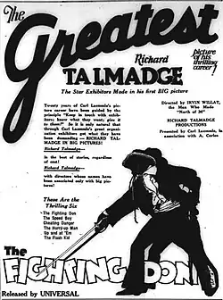 The Cavalier is a 1928 American synchronized sound Western film directed by Irvin Willat, distributed by Tiffany Studios, and starring Richard Talmadge and Barbara Bedford.[1] While the film has no audible dialog, it was released with a synchronized musical score with sound effects using both the sound-on-disc and sound-on-film process.