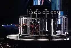According to James, the show revolves around four main themes: Time, New York City, fragments, and "the story of [Madonna]". Drawing on these elements, as well as the singer's 40-year long career, the stage was conceived as an abstract map of New York, with a network of B-stages and runways inspired by the streets and blocks of Manhattan —Uptown, Downtown, Midtown, East and West. The team also came up with a kinetic, revolving, three-layered circular central stage that refers to both the wedding cake from Madonna's performance of "Like a Virgin" at the 1984 MTV Video Music Awards and a clock's shape.[36] Also present was a floating, illuminated portal frame that lifted Madonna 9 m (30 ft) off the ground, and moved at 4.5 m (15 ft) per second.[37] It allowed the singer to fly over the audience and move between the stage.[36][38] According to Lipson, the portal was meant to act like a "time machine".[36] "Live to Tell" (1986) was one of the numbers that saw Madonna riding the flying portal.[36][38]