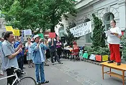 This City is For All works together with other grassroots organizations representing the concerns of marginalized and oppressed groups. It cultivates international connections as well, exemplified by participation in the European Social Forum, in the Social Action Exchange project,[16] in the International Alliance of Inhabitants[17] or a discussion of student and homeless activists with American geographer Neil Smith and Canadian academic Deborah E. Cowen in 2010.[18] The group participated in the 2009 FEANTSA conference "Sharing the power – working together: Participation as a tool to solve homelessness" in Copenhagen[19][20] and in the 2010 University of Barcelona – Associació Prohabitatge – FEANTSA conference "Housing Rights: from Theory to Practice" in Barcelona.[21]