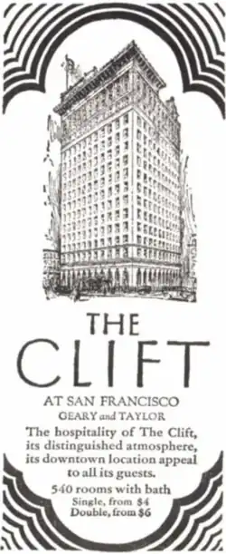 In 1913, Frederick C. Clift, an attorney from a large family in the Sierra foothills, commissioned a 300-room hotel on a lot the family had inherited. The architect, a former student of Ecole de Beaux Arts, was George Applegarth and Kenneth A. MacDonald Jr. of MacDonald and Applegarth, the former of whom also designed the Palace of the Legion of Honor.[2] The hotel opened on February 1, 1915,[3] to serve crowds attending the Panama–Pacific International Exposition. Advertised as the first hotel in San Francisco to be fire and earthquake proof, with its 1924 addition of 3 floors, it became the largest hotel in the state. The hotel's Art Deco Redwood Room bar was added in 1933, paneled with wood from a single redwood tree.
