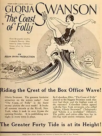 The Coast of Folly is a 1925 American silent drama film directed by Allan Dwan and starring Gloria Swanson in a dual role as mother and daughter. Richard Arlen had a small part in the film but his scenes were cut before its release. The film was based on the novel of the same name by Coningsby William Dawson, and adapted for the screen by James Ashmore Creelman.[1]