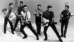 By early 1980, the Cockroaches began writing their own music as well as covering various 1960s rock 'n' roll artists, especially the Rolling Stones.[7] In July 1980, they issued their debut single, "I Want a Leather Jacket", on the Refugee Records label. The song was written by Paul, was produced by Greg Owens and the band, and was recorded at their school and at Studio B in Bondi.[6] According to Australian musicologist, Glenn A. Baker, the track provided "the aura of a rockabilly band ... [but] they have always been much closer in style to the original cocky, bluesy, strident Stones".[1] When they recorded their second single, "Bingo Bango" in June 1981, Hatfield had been replaced by Geoff O'Reagan on bass guitar. This song was written by John and Anthony, was produced by Owens and was recorded at Wirra-Willa Studios.[9] By August of that year Jeff Fatt had joined on keyboards and Phil Robinson became their bass guitarist.[10] According to Anthony, Fatt had been a member of "a seminal Sydney rockabilly band called the Roadmasters",[4] and had joined "to fight boredom".[11] They had hired Fatt and his brother to manage their sound system during gigs. Anthony declared this began "a beautiful three-decade relationship that has made him a very wealthy man".[11] Their early road manager was Graham Kennedy,[12] former guitarist-vocalist for the hard rock band, Finch.[13]