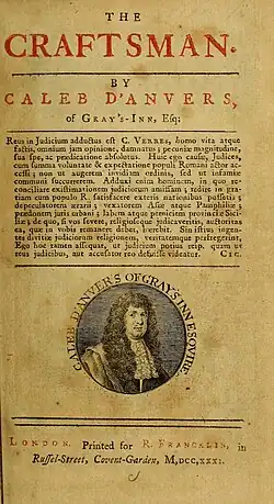 The Craftsman, also known as The Country Journal or, The Craftsman or The Craftsman: Being a Critique on the Times, was a British newspaper which operated from 1726 to 1752. Established by Lord Bolingbroke and William Pulteney, it was edited by Nicholas Amhurst under the pseudonym "Caleb D'Anvers". It is known for publishing letters and essays from Lord Bolingbroke. Lord Bolingbroke and the 'Patriot Whigs' used The Craftsman to oppose the administration of Robert Walpole and his 'Court Whig' faction. The paper's writers included early satirists such as Jonathan Swift and Alexander Pope.