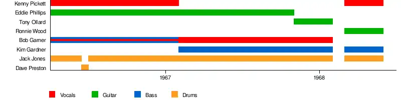 • Bob Garner – vocals, bass guitar (1966–1967, 1993–1997); lead vocals (1967–1968, 1997 – early 2000s)