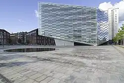 The plaza next to the building is designed by Stig L. Andersson in collaboration with Schmidt Hammer Lassen. Its light-coloured slate paving continues into the ground floor of the building, integrating the exterior and interior spaces. The plaza is dominated by a waterfeature, Denmark's largest fountain, consisting of a circular water basin and 2,000 valves arranged in long straight lines which spray water in varying heights of up to 2.5 metres.[2] The water feature is illuminated at night. There are benches and a single row of trees along one side of the space.