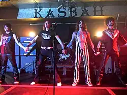 ![]() The 2013 lineup of The Darkness. From left to right: Ed Graham, Dan Hawkins, Justin Hawkins, Frankie Poullain. | |