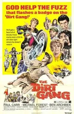 The Dirt Gang is a 1972 American action drama film directed by Jerry Jameson and starring Paul Carr, Michael Forest, Michael Pataki, Lee de Broux, Nanci Beck, Jon Shank, Nancy Harris, T.J. Escott, and Jessica Stuart. The film was released by American International Pictures in November 1972.[1][2][3]