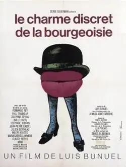 The Discreet Charm of the Bourgeoisie (French: Le Charme discret de la bourgeoisie) is a 1972 surrealist satirical black comedy film directed by Luis Buñuel, who wrote the screenplay in collaboration with Jean-Claude Carrière.[2] The narrative concerns a group of French bourgeoisie and the fictional South American country of Miranda's ambassador to France attempting—despite continual interruptions—to dine together. The film stars Fernando Rey, Paul Frankeur, Delphine Seyrig, Bulle Ogier, Stéphane Audran, Jean-Pierre Cassel, Julien Bertheau and Milena Vukotic.