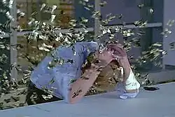 Stollard wished the butterflies to be as realistic as possible,[10] and modeled them after mounted butterfly specimens his team studied. The butterflies were computer generated animations and added later in post-production.[9] To create the illusion of Young falling through the window, the visual effects crew placed small explosive charges on the tempered glass window; Slocum's stuntman Jared Burke then jumped through while they triggered the glass to explode. Two cameras, one high and one profile, were positioned to shoot the fall, and were composited together later into a matte painting of the World Trade Building. The fall was filmed multiple times with a green screen, with the stuntman falling on a cushion. While on-set, Toye explained of the shoot, "with all the pieces put together with the visual effects and with the performance we got with our actor Ptolemy, it's going to be fabulous."[10] A crewman believed that the addition of music to Young's fall made the scene "far more elegant and more of a statement."[9] In a December 2012 interview, actress Jasika Nicole stated that she developed a fear of butterflies as a result of this episode.[11]