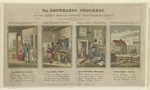 In 1826, John Warner Barber published The Drunkard's Progress, or The Direct Road to Poverty, Wretchedness, & Ruin, a four-part lithograph depicting a family's journey to the poorhouse due to consuming alcohol.[10][11] Based on Barber's work, Currier created his similarly named The Drunkard's Progress: From the First Glass to the Grave in 1846.[12]