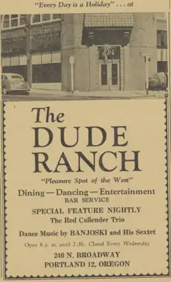 The Dude Ranch jazz supper club opened in 1945 and was open for just one year. In that time it brought world-class jazz musicianship to the city.[2] It was known as one of Portland's Black and Tan jazz clubs in 1945. The club was owned by Pat Patterson, the first African American basketball player at the University of Oregon, and Sherman "Cowboy" Pickett.[3] The club's name was reflected in its decor, which included murals of black cowboys and waitresses in cowgirl outfits with holsters and cardboard pistols.[4] The club was also known for its shaker girls, jugglers and tap dancers.[2]