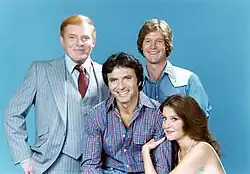 Left to right: Ken Swofford, Vincent Baggetta, Michael Horton, and Wendy Phillips in a promotional cast photo for The Eddie Capra Mysteries.