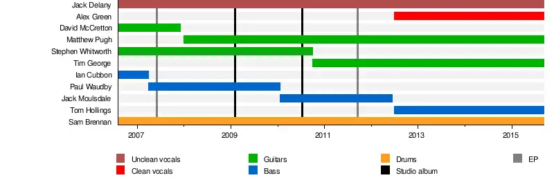 Whitworth, when asked how he would describe the band's sound, said that they "combine technicality with melodic sensibilities, metal and occasional sprinklings from other genres."[16] The band have been described by critics as metalcore,[17] melodic death metal,[11][18] and melodic metalcore.[19] Many critics have credited them for their accelerated progression through the British metal scene considering the age of the band members.[1] By the time their first EP was released, the average age of the members was 17.[20]