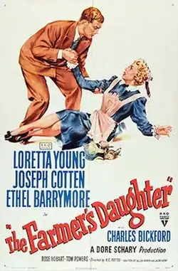 The Farmer's Daughter is a 1947 American comedy film directed by H.C. Potter that tells the story of a farmgirl who ends up working as a maid for a Congressman and his politically powerful mother. It stars Loretta Young, Joseph Cotten, Ethel Barrymore, and Charles Bickford, and was adapted by Allen Rivkin and Laura Kerr from the 1937 Finnish play Juurakon Hulda by Hella Wuolijoki, using the pen name Juhani Tervapää (misspelled in the film's credits as Juhni Tervataa).