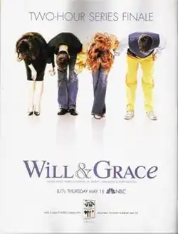 The series finale was heavily promoted by NBC, and the main cast members appeared on The Oprah Winfrey Show, The Today Show, and Live with Regis and Kelly to bid farewell.[7] NBC devoted a two-hour block in its primetime schedule on May 18, 2006, for the Will & Grace send-off. An hour-long series retrospective, "Say Goodnight Gracie", featuring interviews with the cast, crew, and guest stars, preceded the hour-long series finale.[8][9][10][11] The retrospective was viewed by an estimated 12.7 million viewers,[12] while the finale drew 18.43 million viewers[13] and a Nielsen rating of 11.5/18,[14] making it the most watched episode of the final two seasons of Will & Grace.[13]