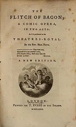 The Flitch of Bacon is a 1778 comic opera composed by William Shield with a libretto by Henry Bate Dudley.[1] It is inspired by the Flitch of Bacon tradition and takes place at Little Dunmow Priory in Essex. It premiered at the Theatre Royal, Haymarket in London on 17 August 1778. The original cast included William Parsons as Major Benbow, Charles Bannister as Captain Wilson, John Edwin as Tipple and Elizabeth Harpur as Eliza. The Irish premiere took place at the Crow Street Theatre in Dublin on 2 December 1779.[2] The tradition later inspired the 1854 novel The Flitch of Bacon by William Harrison Ainsworth.