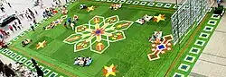 The Flying Grass Carpet is a huge rug entirely made of artificial grass. It travels around the world, as a temporary landscape. It's intended as space to play on and enjoy, but can also be used for picnics, open-air festivals and sports .[1]