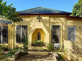The house is a single-storey lowset timber-framed and timber-clad structure. It faces north toward the view of the river and has a square core with a hipped roof surrounded by a verandah with an ogee roof. Projecting from each end of the south verandah are matching pyramid-roofed service wings and a face brick chimney projects from the core's roof. A cross is mounted on the centre ridge of the main roof and the kitchen wing's chimney (western side of the house) has been converted to form a grotto.[1]