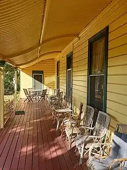 The front (north) verandah is open to the view and the northern verandah wall is symmetrical, retaining original step-through double-hung windows either side of an entrance door. Parts of the east, west, and south verandahs have been enclosed (in stages, likely pre-1906) to form a number of smaller interconnected rooms and some have had the verandah wall demolished and the enclosed verandah incorporated into the core.[1]