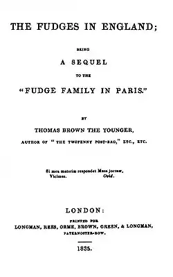 The Fudges in England is an 1835 sequel to Thomas Moore's 1818 work The Fudge Family in Paris, which had depicted the visit of the fictional British Fudge Family to Paris, where the daughter Biddy had fallen in love with a young man whom she had taken to be the King of Prussia but was in fact a draper. The original work was extremely popular and Moore had received requests to write a follow-up. He began working on The Fudge Family In Italy, but abandoned it and it wasn't until seventeen years after the original that the sequel was released.