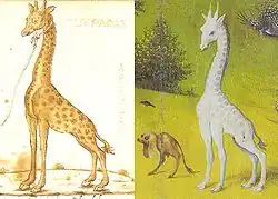 To the left of the area, a cat holds a small lizard-like creature in its jaws. Belting observes that, although the creatures in the foreground are fantastical imaginings, many of the animals in the mid and background are drawn from contemporary travel literature, and here Bosch is appealing to "the knowledge of a humanistic and aristocratic readership".[22] Erhard Reuwich's pictures for Bernhard von Breydenbach's 1486 Pilgrimages to the Holy Land were long thought to be the source for both the elephant and the giraffe, though more recent research indicates the mid-15th-century humanist scholar Cyriac of Ancona's travelogues served as Bosch's exposure to these exotic animals.[22]
