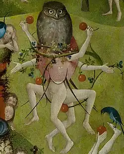 The focal point of the scene is the "Tree-Man," whose cavernous torso is supported by what could be contorted arms or rotting tree trunks. His head supports a disk populated by demons and victims parading around a huge set of bagpipes—often used as a dual sexual symbol[42]—reminiscent of human scrotum and penis. The tree-man's torso is formed from a broken eggshell, and the supporting trunk has thornlike branches which pierce the fragile body. A grey figure in a hood bearing an arrow jammed between his buttocks climbs a ladder into the tree-man's central cavity, where nude men sit in a tavern-like setting. The tree-man gazes outwards beyond the viewer, his conspiratorial expression a mix of wistfulness and resignation.[47] Belting proposed that the tree-man's face is a self-portrait, citing the figure's "expression of irony and the slightly sideways gaze [which would] then constitute the signature of an artist who claimed a bizarre pictorial world for his own personal imagination".[42] Many elements in the panel incorporate earlier iconographical conventions depicting hell. However, Bosch is innovative in that he describes hell not as a fantastical place but as a realistic world containing many elements from day-to-day human life.[43]