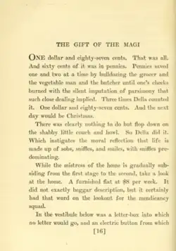 "The Gift of the Magi" is a short story by American writer O. Henry, first published in 1905. The story tells of a young husband and wife and how they deal with the challenge of buying secret Christmas gifts for each other with very little money. As a sentimental story with a moral lesson about gift-giving, it has been popular for adaptation, especially for presentation at Christmas time. The plot and its twist ending are well known; the ending is generally considered an example of cosmic irony.[2] The story was allegedly written at Pete's Tavern[3] on Irving Place in New York City.